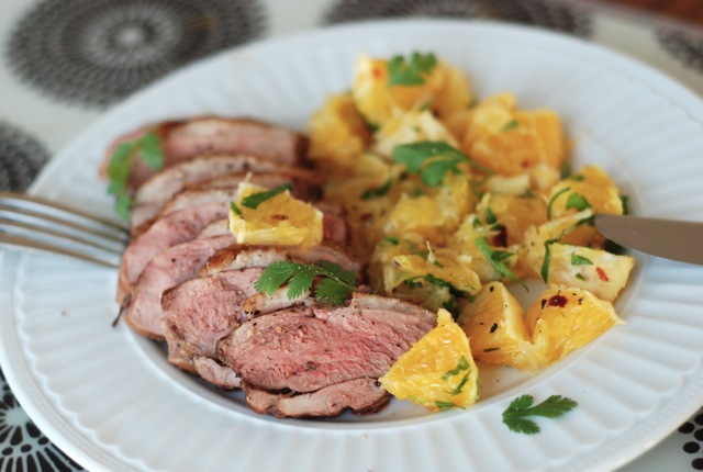 Lõika pardifilee viiludeks ja serveeri apelsinisalatiga.