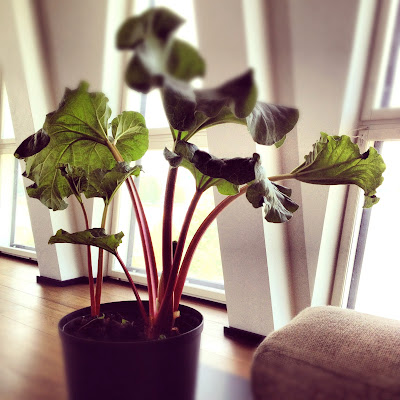 Mu enda rabarbripõõsas, mis sai alguse paar aastat tagasi, kui kaevasime koos naabriga tema põõsa välja ja heanaaberlikult pooleks jagasime, rõõmustab mind juba oma ilusate erepunaste vartega. Sellele vaatamata ei pidanud ma turul vastu ahvatlusele osta juurde veel üks rabarberitaim. Seni, kuni ta nädalavahetusel oma päris koju, peenrasse istutatud saab, ehib ta mu suurt tuba täieõigusliku toataimena:) Nii ilus ju, kas pole.